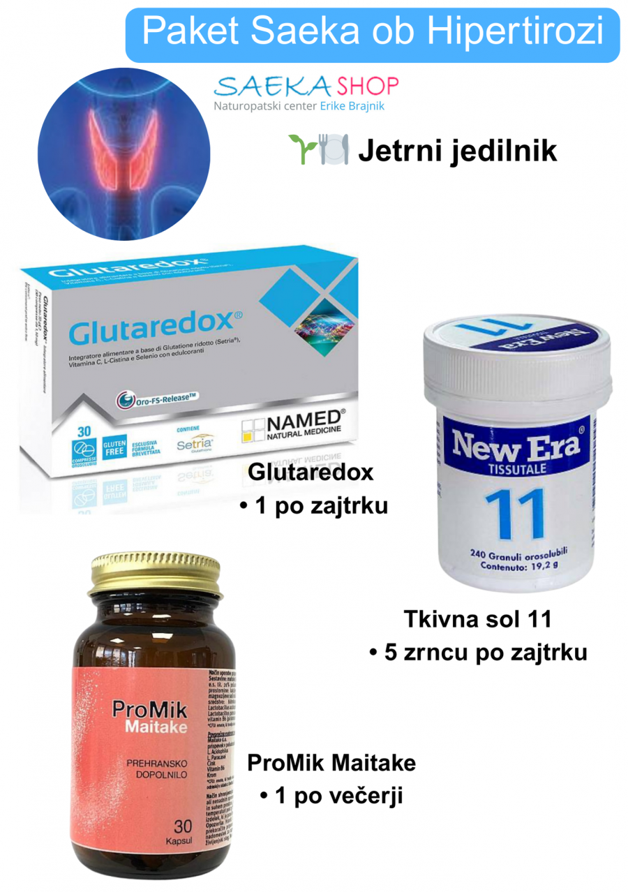 Ob Hipertirozi jetrni jedilnik, Glutaredox – 1 po zajtrku, ProMik Maitake – 1 po večerji, Tkivna sol 11 – 5 po zajtrku